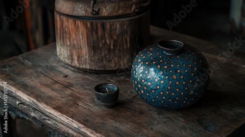 © embun, Fototapeta premium Rustic wooden table holds ceramic objects of varying shapes