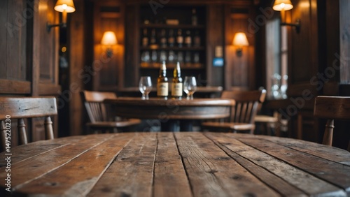 © The Stock Hub, Fototapeta premium Rustic Wooden Table in Cozy Bar Setting with Ambient Lighting