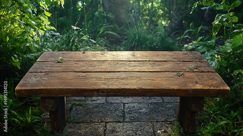 Fototapeta premium Rustic Wooden Table in Lush Garden