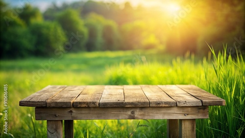 © Caitlin, Naklejka premium Rustic wooden table standing alone in a serene setting, surrounded by a soft, blurred green grass background with subtle natural textures and tones.