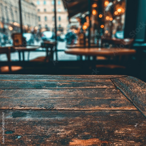 Fototapeta premium Rustic Wooden Table Top In Cafe Interior With Blurred Background