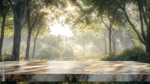 © 99 RIC, Obraz premium Rustic Wooden Table with Apple Orchard in the Background