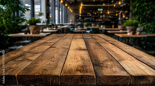 © Arii, Obraz premium Rustic Wooden Table with Cafe Interior.