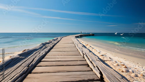 Fototapeta premium Rustic Wooden Walkway on Tranquil Sandy Beach with Distant Seabirds. Coastal...