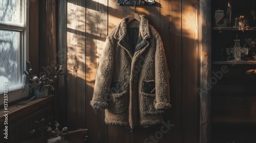 Fototapeta premium rustic wooden wall in a warm room, with soft light filtering through a window, giving a peaceful, wintery atmosphere.