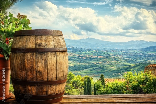 © AlparadiseDesign, Fototapeta premium Rustic wooden wine barrel framed by Tuscan landscape view.