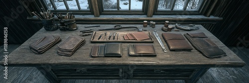 © Trionorejo, Obraz premium Rustic Workshop Table with Leather Crafting Tools by a Window