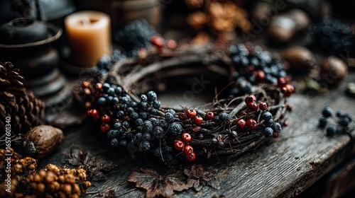 © PC, Fototapeta premium Rustic wreath with dark berries