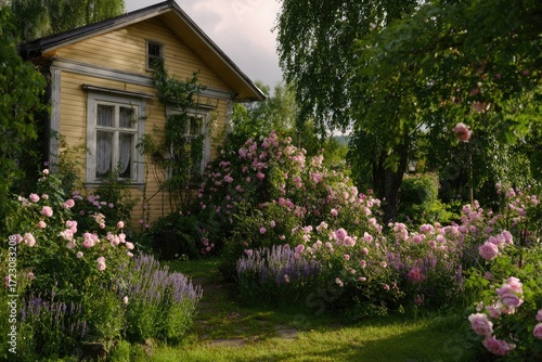 © Saso, Fototapeta premium Rustic yellow house, vibrant rose garden