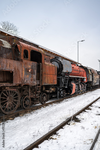 © Rudolf, Obraz premium Rusty Abandoned Steam Locomotive in Winter Railway Yard