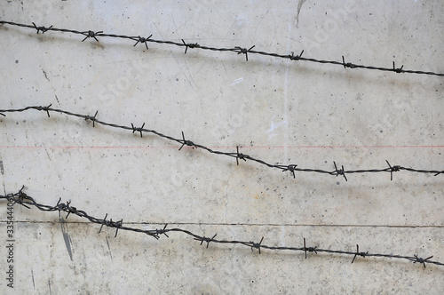 © zilvergolf, Obraz premium Rusty barbed wire on concrete wall background.