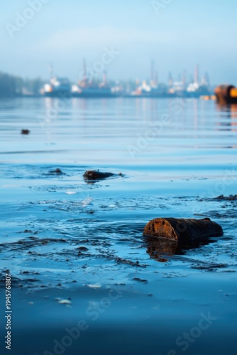 © Iryna, Obraz premium Rusty barrel floating in polluted harbor water with blurred ships on the distant skyline and oily surface at low tide