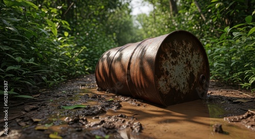 © MDTOUFICKAHAMAD, Fototapeta premium Rusty barrel lying on a muddy forest path