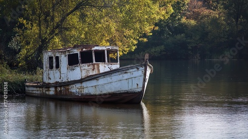 © Infinity, Fototapeta premium Rusty Boat on Calm Lake: Nature's Serene Embrace