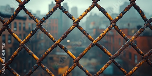© mochiro, Fototapeta premium Rusty Chain Link Fence in Urban Setting: A Glimpse of Cityscape Through the Grid
