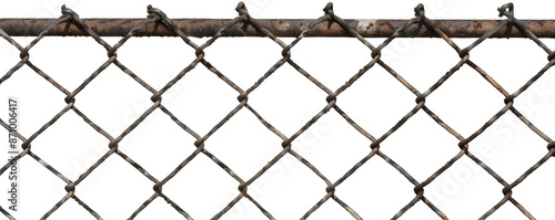 Fototapeta premium Rusty chain-link fence topped with barbed wire, representing security,...