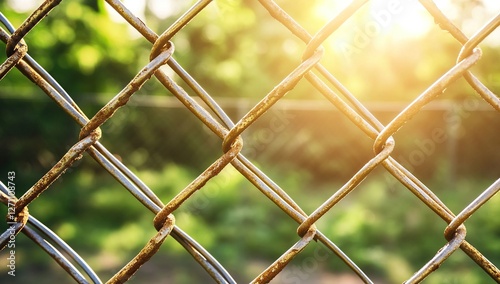 © Selvi, Fototapeta premium Rusty Chain Link Fence Under Sunlight in Lush Greenery