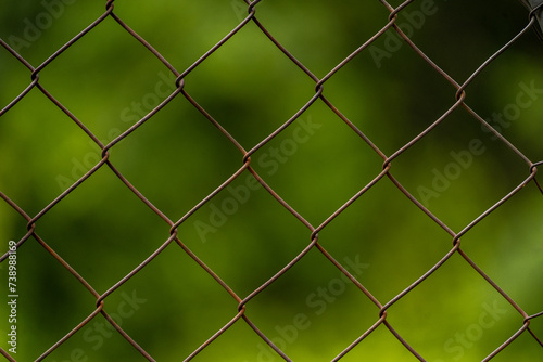 © Thomas Holmes, Fototapeta premium Rusty chain link fence up close with green plant bokeh background