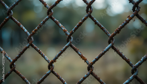 © Yuka, Fototapeta premium Rusty chain-link fence with blurred background of nature.
