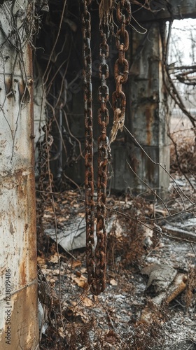 Obraz premium Rusty Chains Hanging in Abandoned Industrial Space with Overgrowth