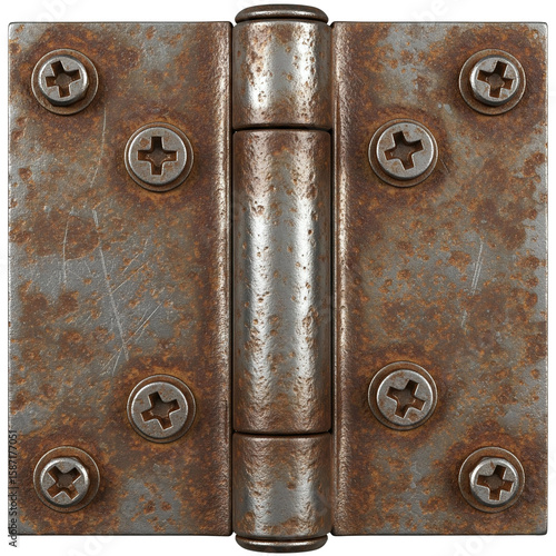 © Witawat, Fototapeta premium rusty door hinge with screws isolated, vintage metal hardware texture, corroded iron joint detail, weathered mechanical part, old rustic building element on transparent background (PNG)