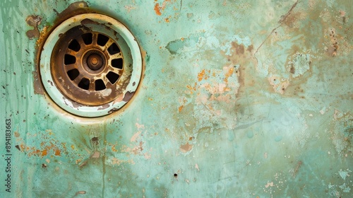© The 2R Artificiality, Obraz premium Rusty drain in light green sink with ample copy space
