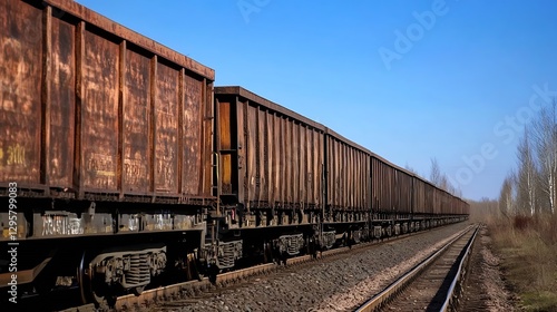 © Generative AI, Fototapeta premium Rusty Freight Train Cars Along Abandoned Railroad Tracks with Blue Sky in the Background : Generative AI