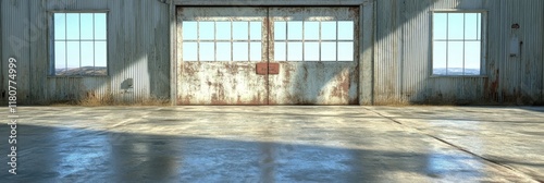 Fototapeta premium Rusty Hangar Interior with Panoramic Windows and Concrete Floor