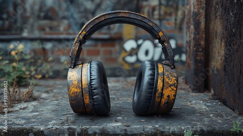 © hanafi 99d, Fototapeta premium Rusty Headphones on a Concrete Surface