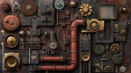 Fototapeta premium Rusty industrial machinery and equipment arranged in chaotic yet artistic manner, showcasing various gears, pipes, and mechanical components