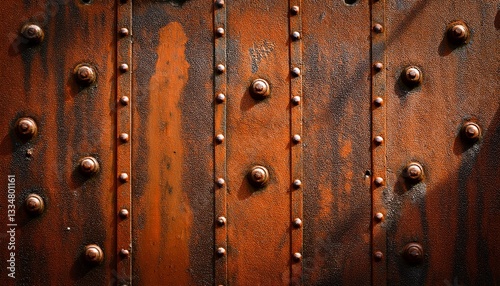 Fototapeta premium Rusty metal background, scratches stains rivets and seams on textured iron...