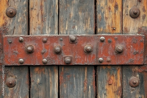 © EUT, Fototapeta premium Rusty metal band on aged wooden planks. Ideal for rustic, vintage, or historical themes.