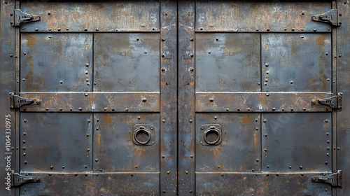 © Phuwadon, Fototapeta premium Rusty metal double doors with bolts and circular handles against a textured surface.