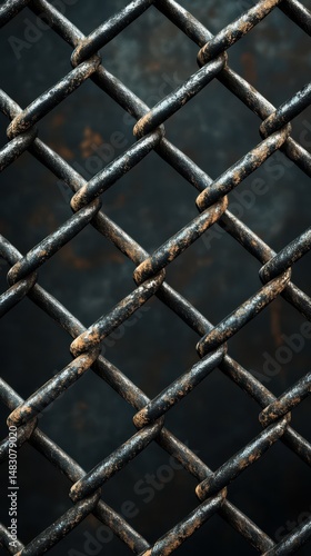 © Georg, Fototapeta premium Rusty metal fence with geometric patterns and textures in a dark background