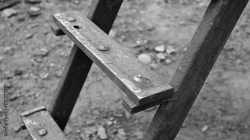 Fototapeta premium Rusty metal ladder in soft black and white tones highlighting texture and vintage aesthetics on a weathered ground surface.