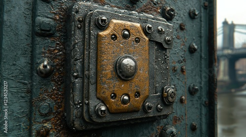 © mlangsen, Fototapeta premium Rusty metal lock on bridge gate, city backdrop