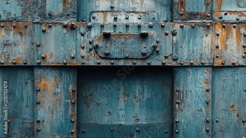 © NFTNexus, Naklejka premium Rusty metal surface with rivets and peeling paint detailed texture for industrial backgrounds or design elements Copy Space