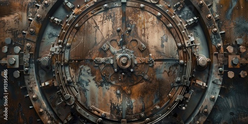 © Murda, Fototapeta premium Rusty metal vault door with intricate details.