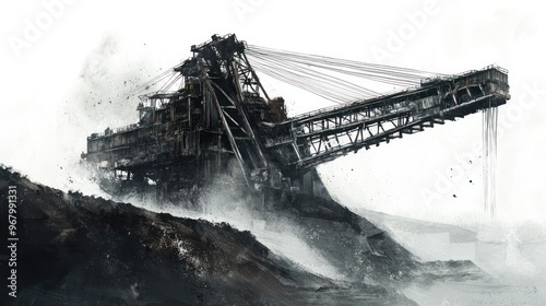 © Rere_Art151, Obraz premium Rusty Mining Excavator Against a Dusty, White Sky