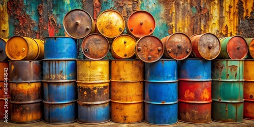 © Stock Spectrum, Fototapeta premium Rusty Oil Barrels Stacked Against a Multicolored Wall, Close-up Composition, Industrial, Storage, Waste, oil barrels, rust