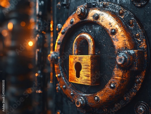 © Wuttichai, Fototapeta premium Rusty Padlock with Clock Face Symbolizing Time Based Security Features