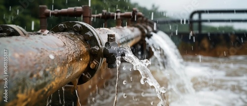 Fototapeta premium Rusty pipes leak water in a lush green setting, highlighting decay amidst a...