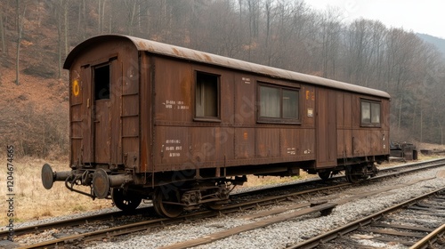 © Truprint, Fototapeta premium Rusty railcar sits abandoned near overgrown tracks in a desolate landscape