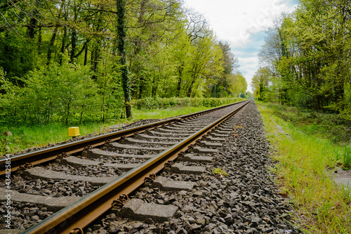 © Viktor, Fototapeta premium Rusty rails go into the distance in the forest.