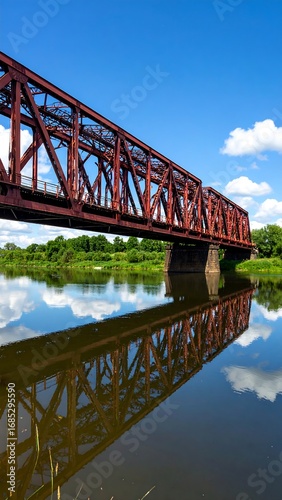 © Bm, Obraz premium Rusty red train bridge over a calm river