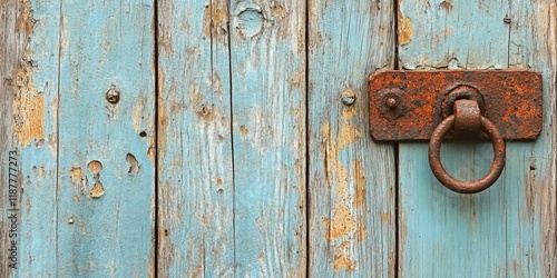 © ngamaz, Fototapeta premium Rusty ring on weathered blue door. Old wood texture background. Design