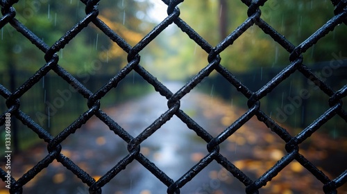 © Наталя Ласько, Fototapeta premium Rusty steel mesh fence with grid pattern showcasing wear and tear in urban setting