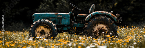 © Arief, Naklejka premium Rusty Tractor in Wildflowers - Realistic Image