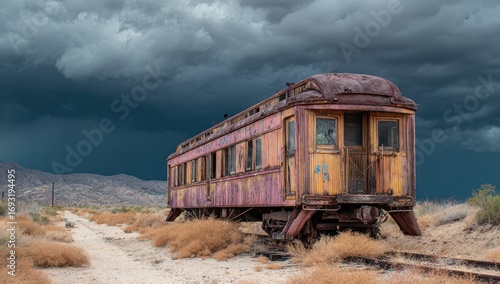 © rifky, Fototapeta premium Rusty train car under stormy sky