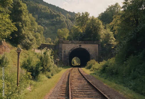 © Алексей Ковалев, Fototapeta premium Rusty train tracks lead into a dark tunnel in a desaturated landscape